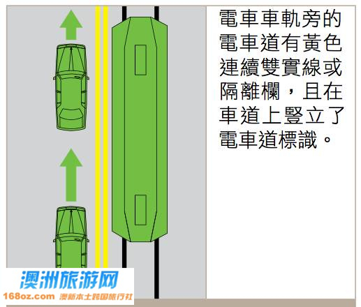下图中,除非为了躲避障碍物,否则任何时候均不得在电车道上行驶。只有在车辆横穿电车道专用缺口处,才能横穿电车道。