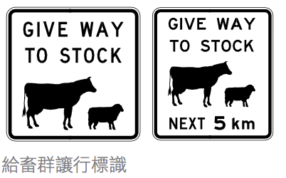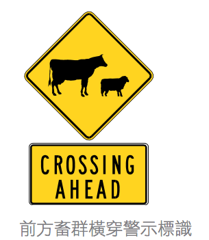 在澳洲开车,路上随时可能遇到奇怪的动物哦!乡村道路上给牲畜让路的标识,在靠近时需要控制车速,以便遇到动物时能减速或停车,避免撞到动物。