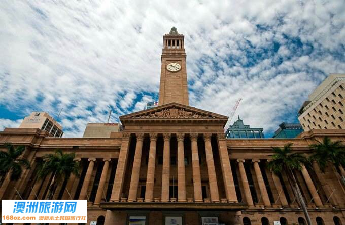 布里斯班市政厅是布里斯班的标志,也是澳大利亚最富丽堂皇的市政厅。布里斯班市政厅这座具有意大利文艺复兴风格的棱柱型塔式建筑建于1930年,布里斯班市政厅钟楼上的大钟每隔15分钟就要敲响一次,是为了提醒澳洲人,要珍惜时间,不要虚度光阴。