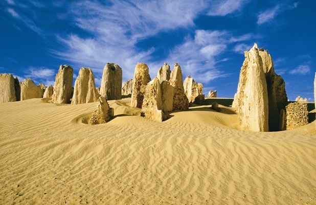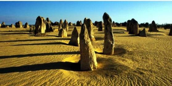 尖峰石阵(The Pinnacles)位于西澳首府城市珀斯以北245公里处的南博格国家公园内(NambungNational Park),公园内的奇形怪状的石柱遍布在沙漠中形成独特的奇观,在平坦的沙丘中,四处矗立着石灰岩尖塔式的石笋,最高的有1.5英尺,小的只有手指头那样大,犹如古战场的布阵,被誉为“尖峰石阵”。 当年,初到这里的荷兰探险家,以为是发现了美丽的南方大陆废弃的城堡呢。当然,走近来看的结果令这些探险家失望了,只是一些“石笋”而已。不过,后来的人经过分析,还是找到一些值得探险家骄傲的东西。这不是普通的石笋,而是不知多少年之前,生长在这里的植物扎的根在大地上。后来,大地干竭了,植物干枯了,这些埋在地下的根部就变成了化石。再后来,地表一层层的风化了,这些根部就露出莱了,成了海边一景。