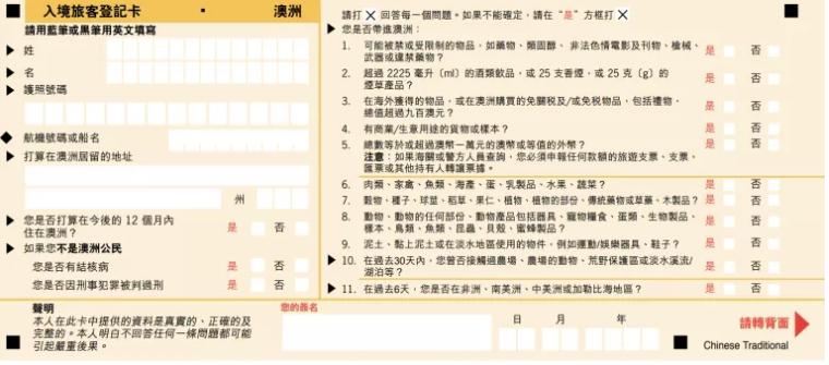 您能否顺利出关,此卡至关重要。务必如实填写此卡。如果有申报项,在“是”右方框内打“X”.