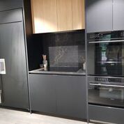 • 厨房内配有木色橱柜、瀑布式边缘的石质厨台和Bosch不锈钢家电