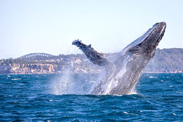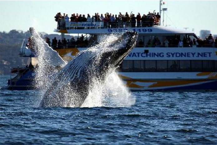 从悉尼港登上21米长的超豪华双体游船出海观鲸,观鲸季为每年的5月-11月。游船海上巡游时间大约4小时。可以看到长18M,重大40吨的鲸鱼及海豚在海中蛇形翻转,鲤鱼跳龙门式的跳跃,巨型V形尾拍水等表演。