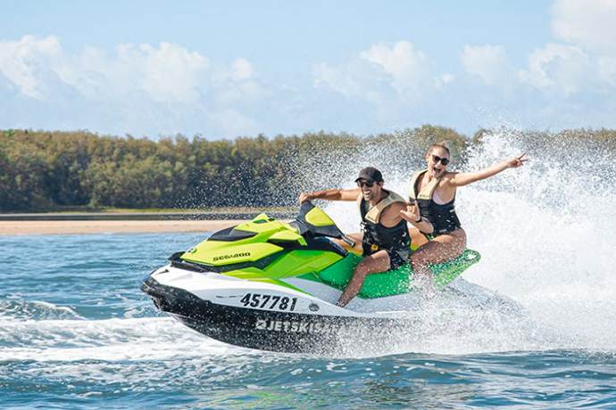 3,90分钟摩托艇体验-沿着南斯特德布鲁克岛美丽的热带亚热带海岸一路狂奔。向北行驶20公里,途经美丽的岛屿,沙滩沙洲和红树林,然后在South Stradbroke岛上美丽的热带酒吧停下来休息一下,然后转身乘坐20公里回家。
