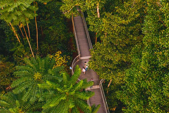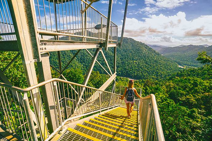 凯恩斯驱车90分钟抵达-始建于2007年的玛姆雨林天空步道坐落于占地90万公顷的热带雨林,是世界遗产保护名录。该雨林已经有上亿年的历史,自然考古价值巨大。空中漫步是耗资5000万澳元修建而成,修建空中漫步长廊也是出于提升热带雨林旅游的体验及环保和更好保护原始雨林的举措。雨林树冠高约30M的,天空长廊就建于树冠之中,,漫步需要1.5小时,途中有悬臂,观景塔。雨林空气极度清新,含氧量极高,是健身保健的好场所,漫步中可以观赏到罕见的植物植被,稀有动物和鸟类。对丰富自然知识和了解上亿年的雨林及养生保健都会受益匪浅。
