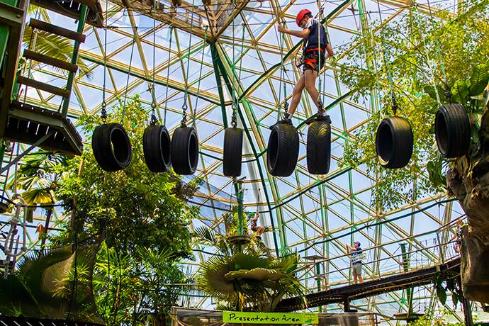 2010年对外开放的凯恩斯野生动物圆顶展馆是全球第一个搭乘空中绳索高空滑行观赏野生动物的场馆。高20M的巨大弧形建筑立面有约60种动物。动物在类似天然雨林环境中生活。有罕见的青蛙,10多种蜥蜴,乌龟,鳄鱼,罕见的微型沙袋鼠等。还有考拉和树熊。您可以游玩体验比较刺激的:高空滑索行走,穹顶蹦极、飞跃鳄鱼池、飞檐走壁等等。